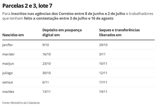 Jun 20, 2021 · o calendário de pagamentos da 3ª parcela do auxílio emergencial 2021 prevê novos pagamentos neste domingo (20). Jun 23, 2021 · liberada a 3ª parcela do auxílio emergencial para nascidos em maio e beneficiários do bolsa família com nis de final 5 fila em agência da caixa no rio para o pagamento do auxílio emergencial. Ao todo cinco grupos já receberam este ciclo, veja mais abaixo. May 07, 2021 · atenção! Esse grupo segue o calendário regular de pagamento do programa, que é realizado nos dez últimos dias úteis de cada mês, de forma escalonada, de acordo com final do nis (número de identificação social). O calendário prevê que o depósito da primeira parcela vai ocorrer entre 6 e 30 de abril, com saques em dinheiro entre 4 de maio e 4 de junho. Mas muitos beneficiários querem saber quando vão receber a segunda parcela e poder sacar. Os depósitos do auxílio emergencial para o bolsa família também foram concentrados na conta poupança social digital pelo aplicativo caixa tem. Jul 02, 2020 · confira o calendário de saque da 3º parcela do auxílio emergencial veja a partir de que data você poderá sacar a terceira parcela do auxílio emergencial 02/07/2020 às 10:08 Jun 05, 2021 · portanto, o calendário da terceira e quarta parcela do auxílio emergencial para este grupo, será concluído nos dias 30 de junho e 30 de julho, respectivamente. Apr 27, 2021 · lote extra do auxílio emergencial vai beneficiar 206 mil famílias grupo adicional de contemplados vai entrar no calendário do próximo pagamento, com início em 16 de maio A expectativa é que os pagamentos sejam iniciados no próximo dia 16 para as pessoas que nasceram em janeiro e termine em junho para os beneficiários nascidos em dezembro. Jun 15, 2021 · o governo federal apresentou uma nova mudança no calendário de pagamento da 3ª parcela do auxílio emergencial 2021, antecipando a data do crédito em poupança social digital e também da.